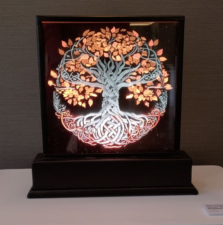 Thereafter, the materiality of each cut of glass, etched gradation and every brush stroke is my expression of that design, my personal contribution to the narrative. The understanding of the materials, the differing characteristics of glass, its ability to morph into the piece I envisage it to become; how does it cut, its colour changes in light, its response to heat and ability to hold fired paint. I also collaborate with other artists either in the unique creation of metalwork and its ability to present the glass, or the use of vinyl cut stencils to deliver flexible solutions.