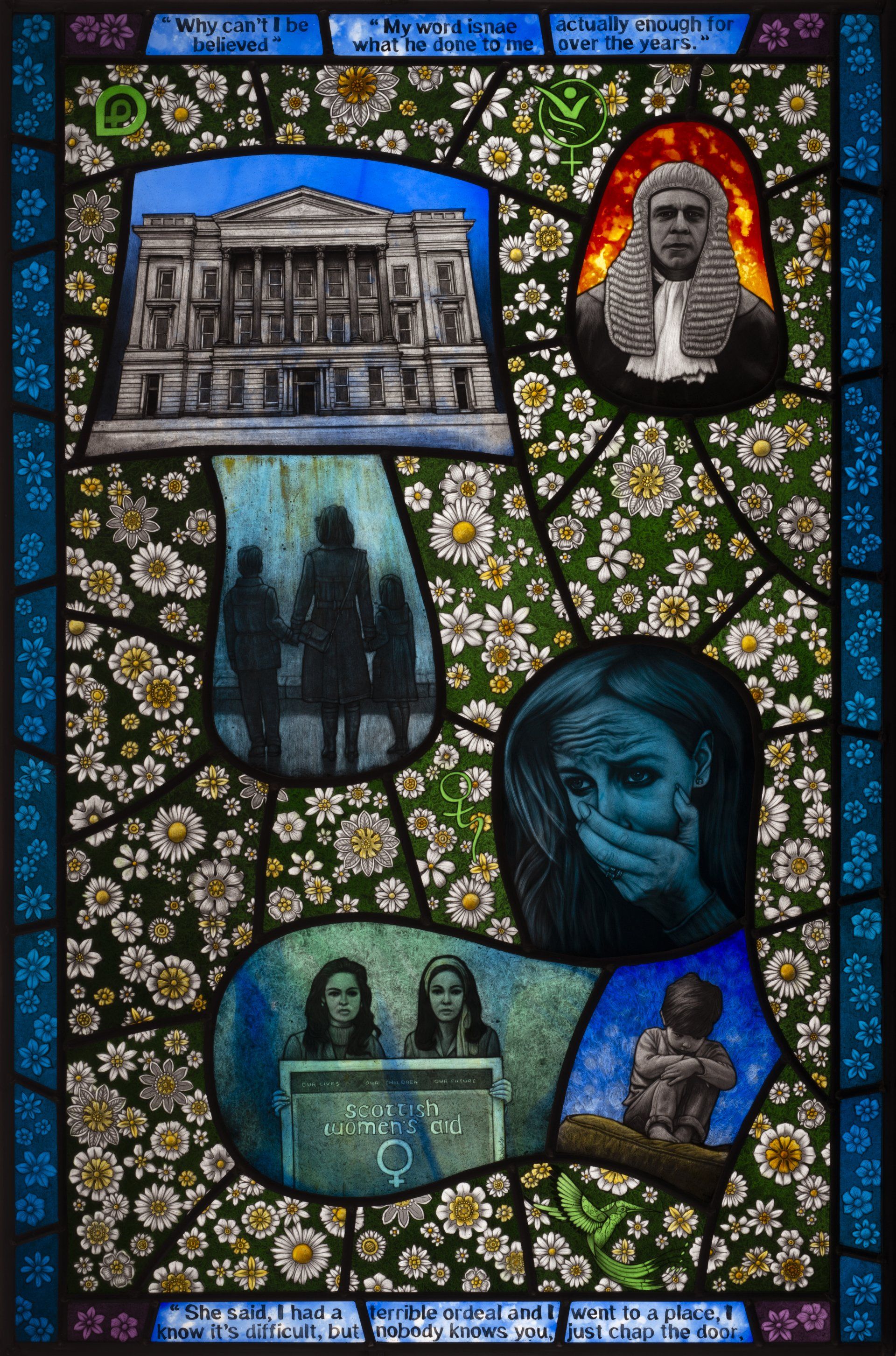 The most recent major project was ‘Glass Walls’ whose original aim was to create a stained-glass installation in light boxes, depicting the sweep of progress being made in the justice response in Scotland to domestic abuse.