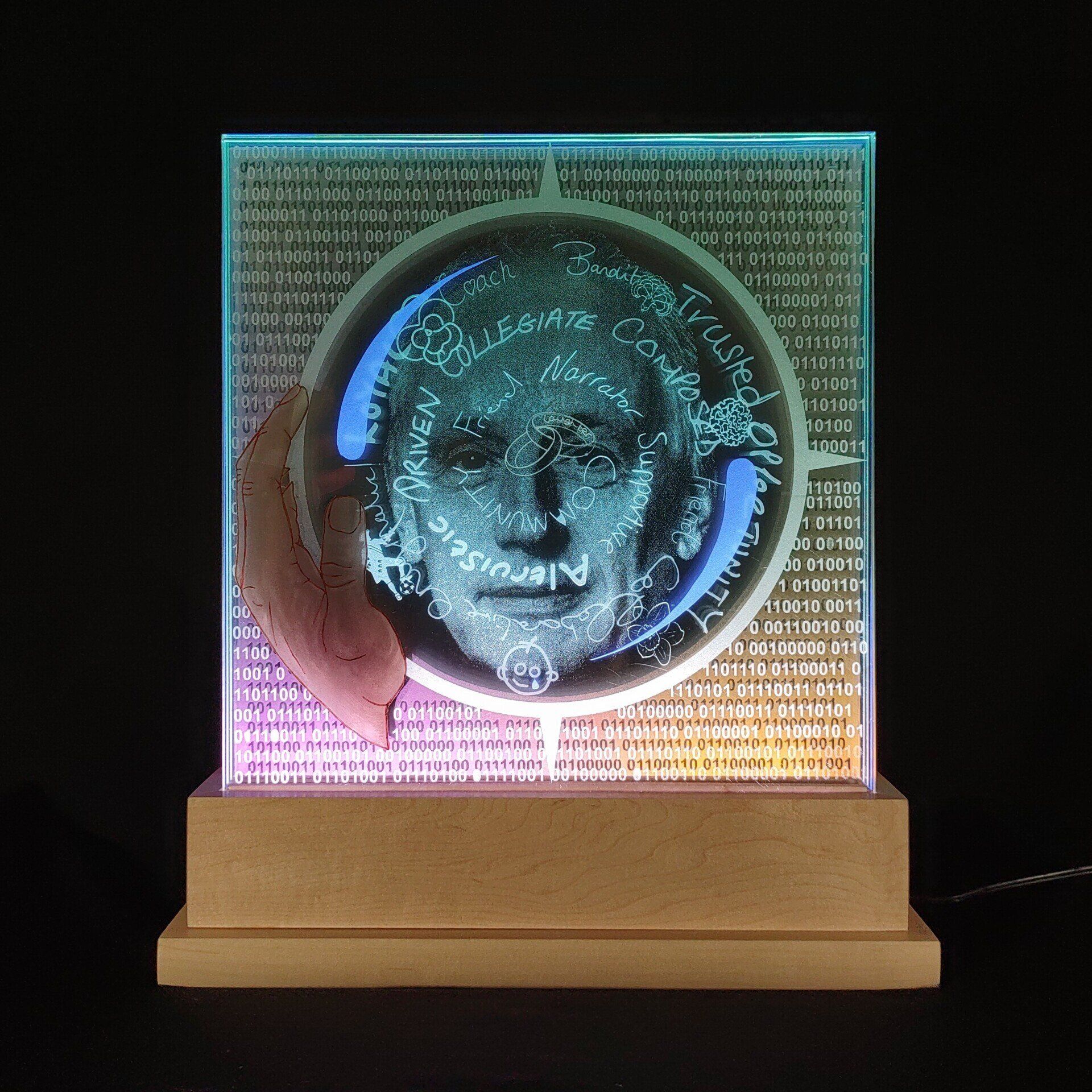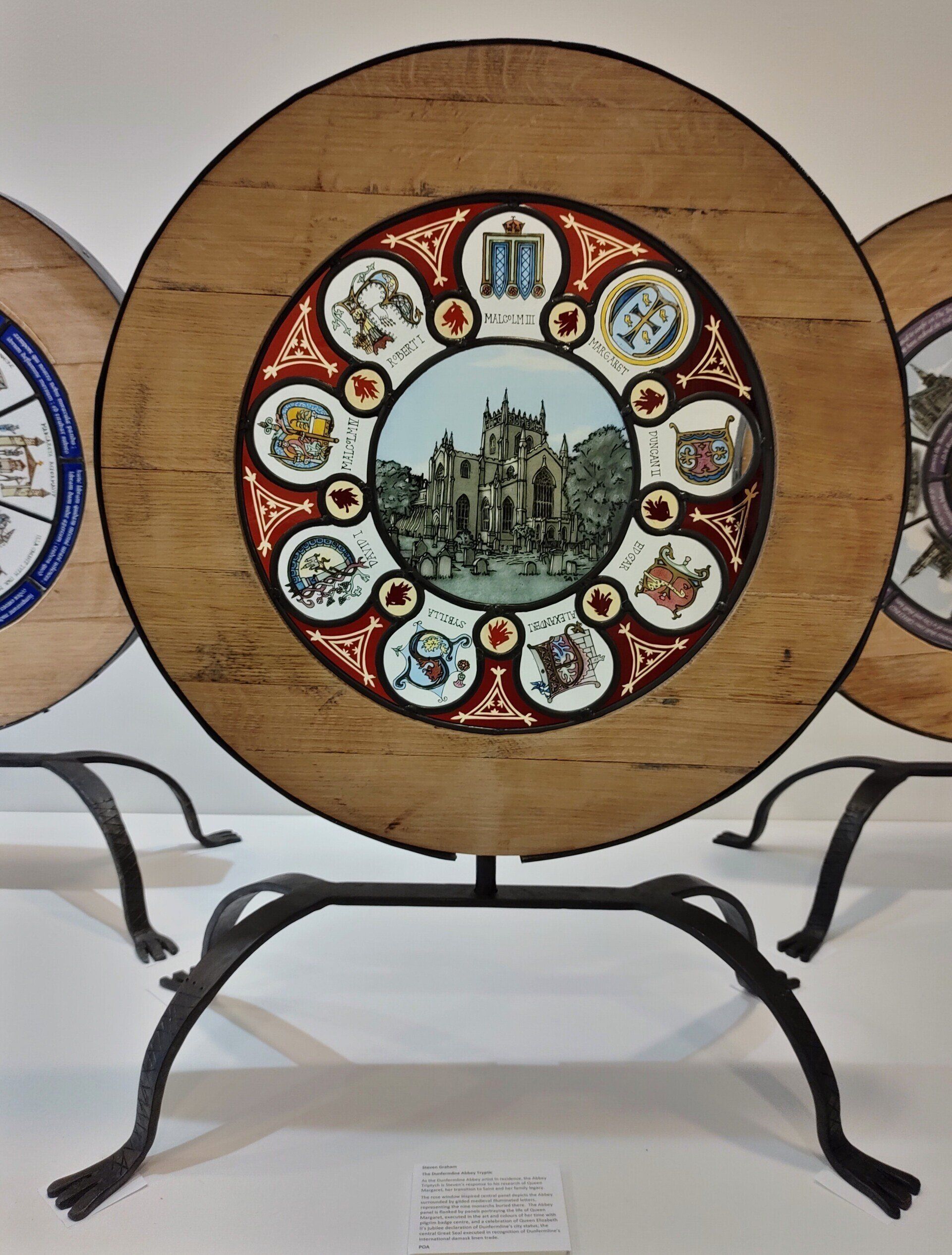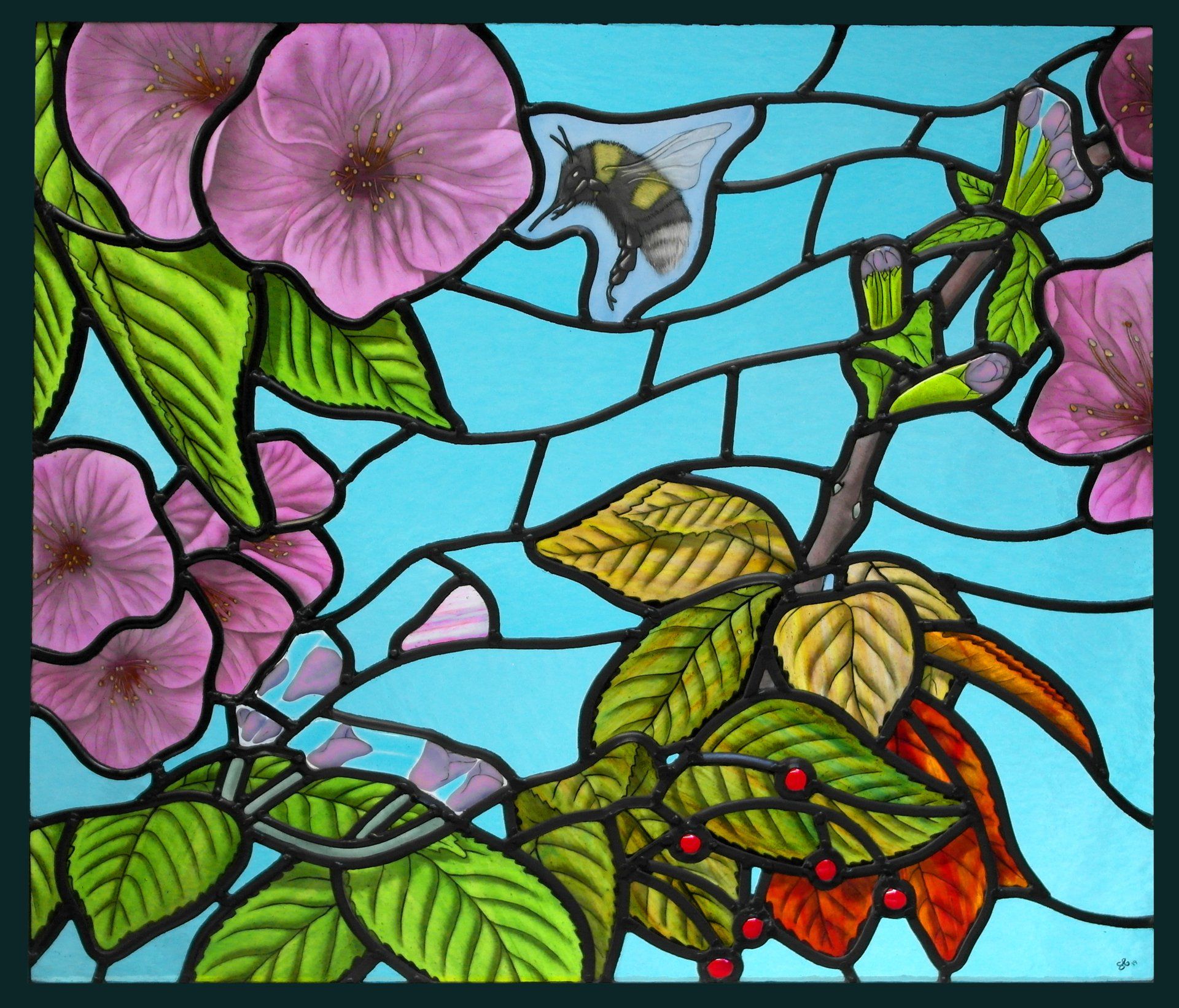 Thereafter, the materiality of each cut of glass, etched gradation and every brush stroke is my expression of that design, my personal contribution to the narrative. The understanding of the materials, the differing characteristics of glass, its ability to morph into the piece I envisage it to become; how does it cut, its colour changes in light, its response to heat and ability to hold fired paint. I also collaborate with other artists either in the unique creation of metalwork and its ability to present the glass, or the use of vinyl cut stencils to deliver flexible solutions.