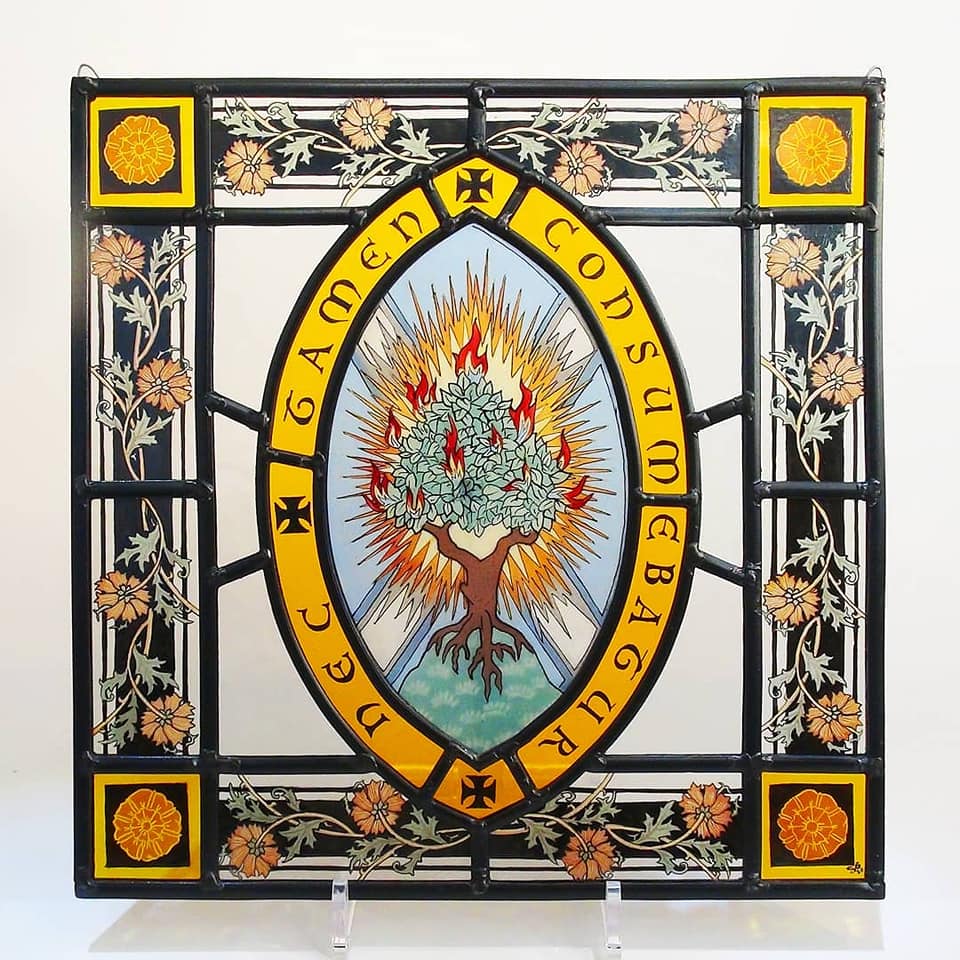 As a young child I was captured by the transmitted colours of glass and its ability to transform the atmosphere of a place. My practice seeks to replicate this marvel through the making of traditionally painted acid etched stained glass panels and cast sculptures.